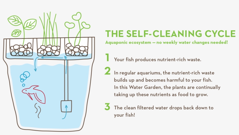 Back to the roots water garden. The fish waste fertilizes the plants on top and the plants clean the water so fewer water changes required. The fish waste fertilizes the plants on top and the plants clean the water so fewer water changes required. Your water garden becomes a self cleaning fish tank that also grows fresh food up top. This size of the tank is best for 2 to 3 fishes.